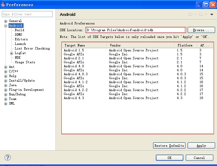 4、配置eclipse的Android SDK路径,晚上以上步骤之后,我们还需要将Android的SDK环境添加进eclipse中,在给eclipse添加完ADT后,点击“Window”-》“Preferences”可以看到Android项,单击右侧将会设置Android SDK路径的框框,设置完成后,右侧下方会列出已经下载的Android SDK版本。如下图所示: