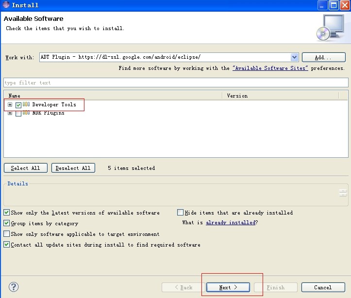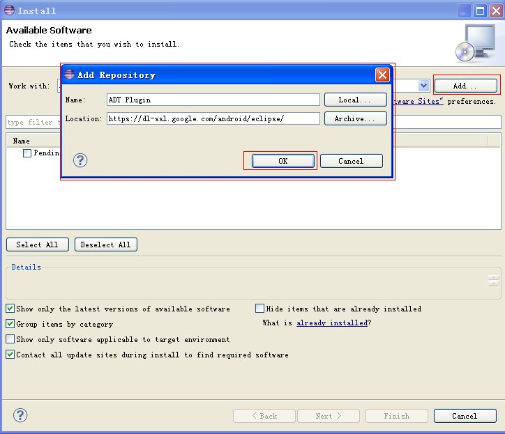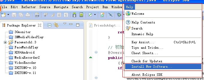 3、安装eclipse及配置eclipse的Android开发环境。eclipse下载后直接解压到硬盘上即可,运行eclipse.exe,首次运行需要设定workspace路径。正常启动后,为了让eclipse能够创建Android工程,则需要添加ADT插件,作者采用联网从google上下载。如下图所示: