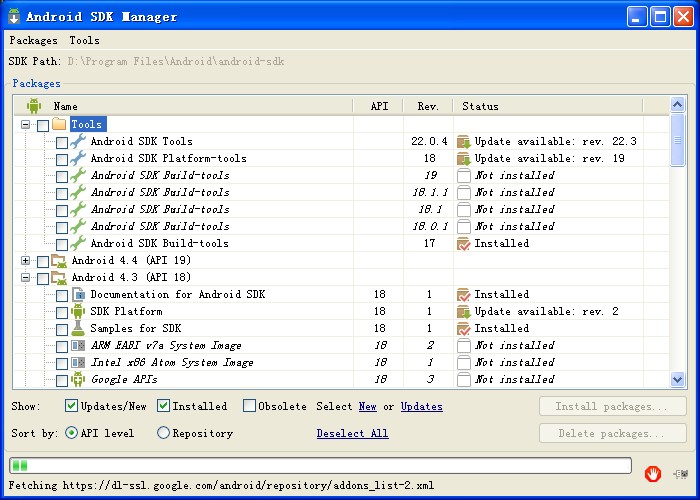 2、安装Android SDK,从网络上下载Android SDK安装包,假设安装到D:\Program Files\Android\android-sdk目录下,此刻android-sdk中仅包含一个Android SDK的空壳,还没有任何版本的SDK,需要双击目录下的SDK Manager.exe来安装需要的Android某个版本的SDK(该步骤也可以在以后需要的时候执行),如图1所示。